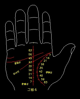 유년법(流年法) : 그림4에 표시된 연령대와 같이 대상자의 나이와 현재의 손금위치를 확인 비교하여 해당하는 유년의 운수가 성운/쇄운 인가를 판단하게 되는데 생명선은 건강관계를 운명선은 사업관계의 흥망성쇠를 판단하게 된다.